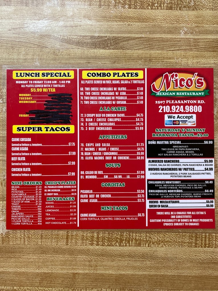 Contact Information: Nico’s Mexican Restaurant Address: 2507 Pleasanton Rd, San Antonio, TX 78221 Phone: (210) 924-9800